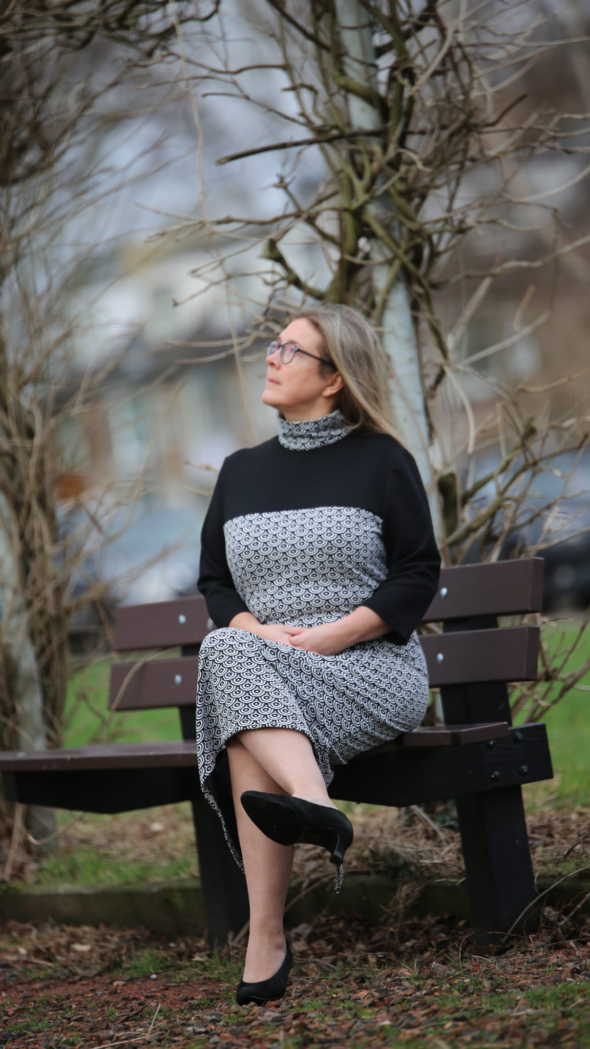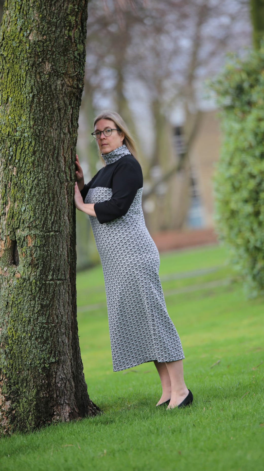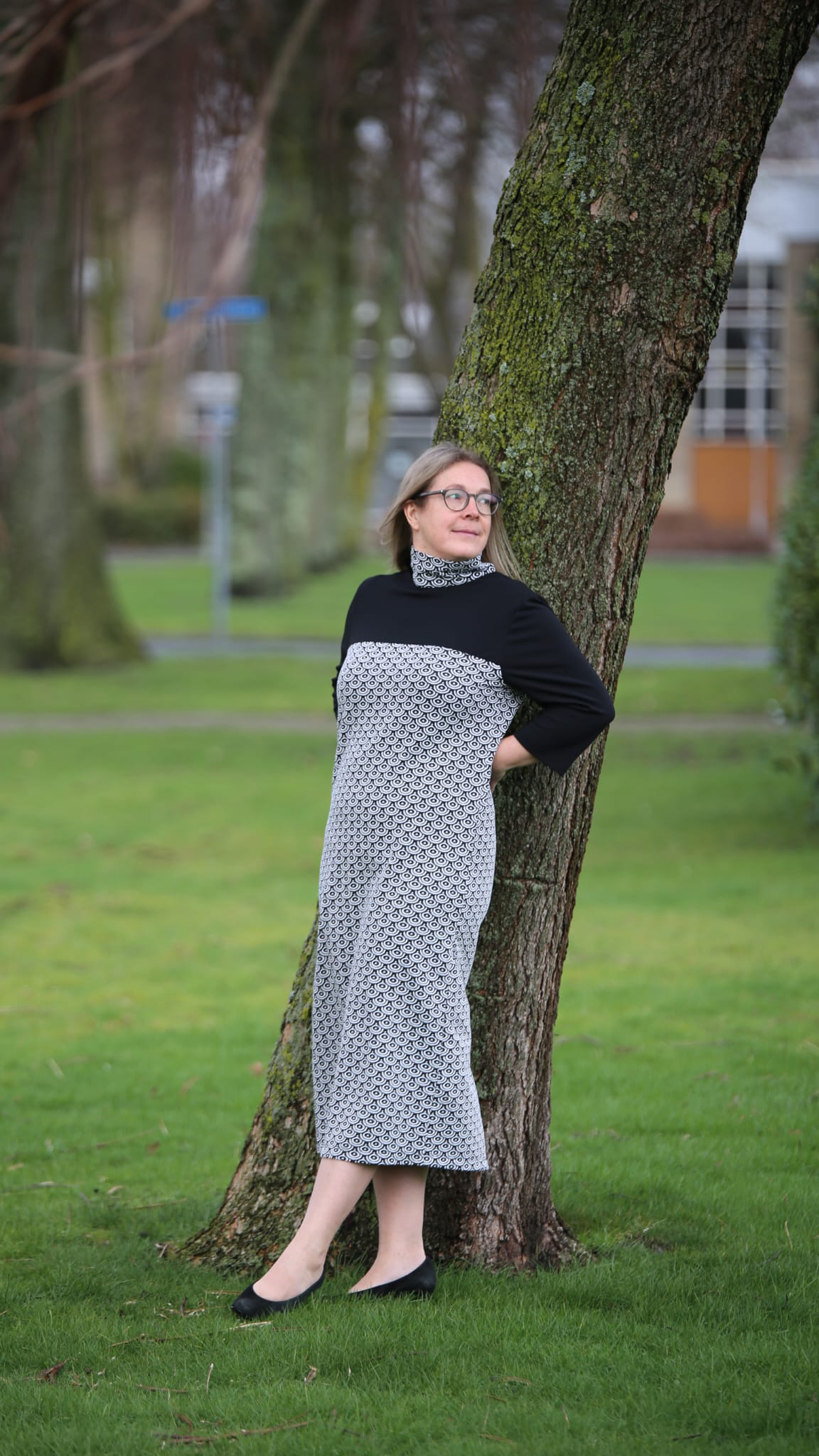 Rana, een 2-delige jurk met opstaande boord in 3 lengtes. Met Rana zijn eindeloos veel variaties te maken, zoals; de jurk en mouwen van dezelfde stof, en de boven passen met voord van een andere stof, of de jurk van een stof en de boven passen, boor den mouwen van een andere stof. Het is ook mogelijk om de jurk van 1 stofsoort te maken en accenten aan te brengen.