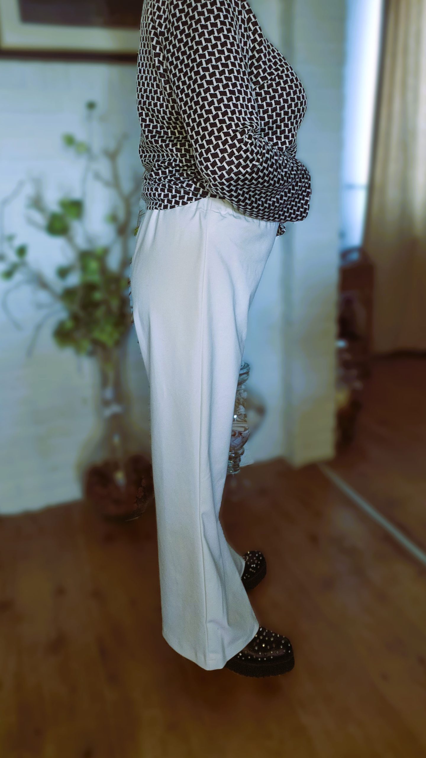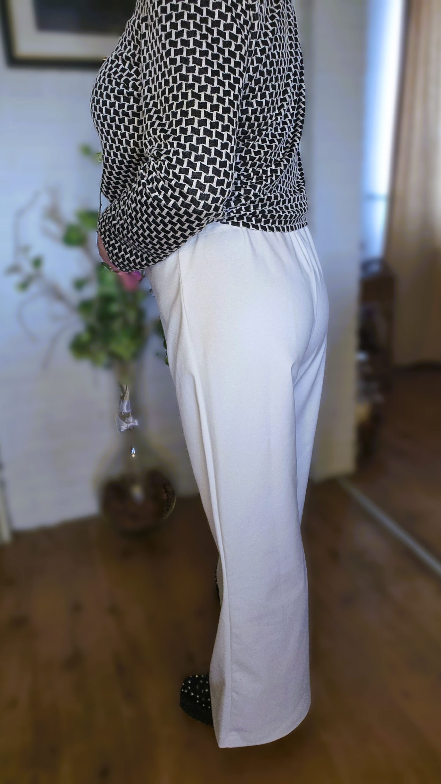 Danielle is een broek met aangeknipte elastieken band en flared pijpen. De lengte is 105 cm. De breedte aan de onderkant van de pijpen is rond de 80 cm. Danielle is alleen in rekbare stofsoorten te maken wat erg prettig dragen is.